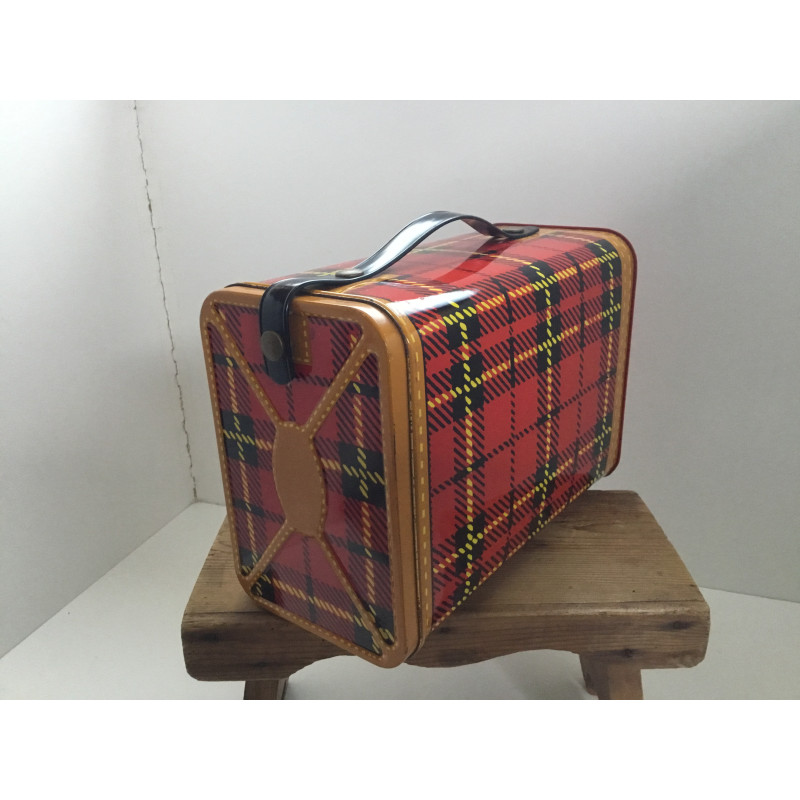 Fin skovtursmadkasse med 5 bakker i rød ternet metal, pæn velhodlt både indeni og udvendig.