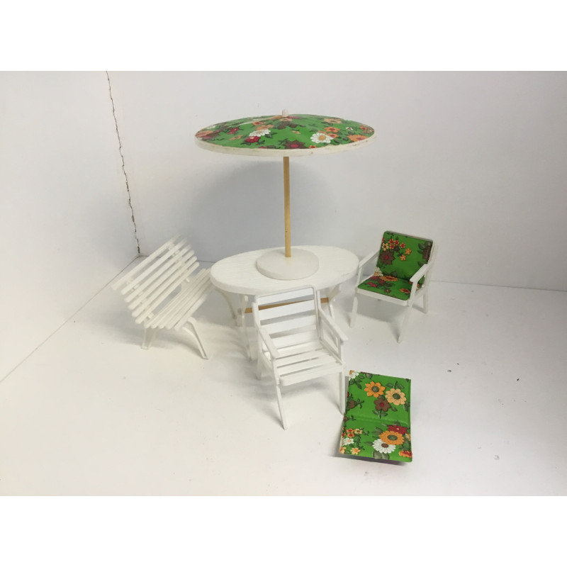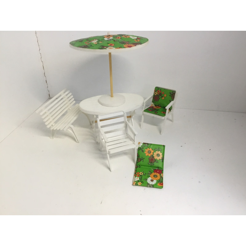 Fin sæt dukkemøbler. 2 stole, 1 bænk, 1 bord og 1 parosol, med plastik hynder til stolene.